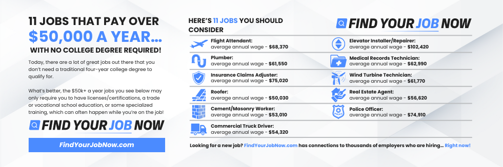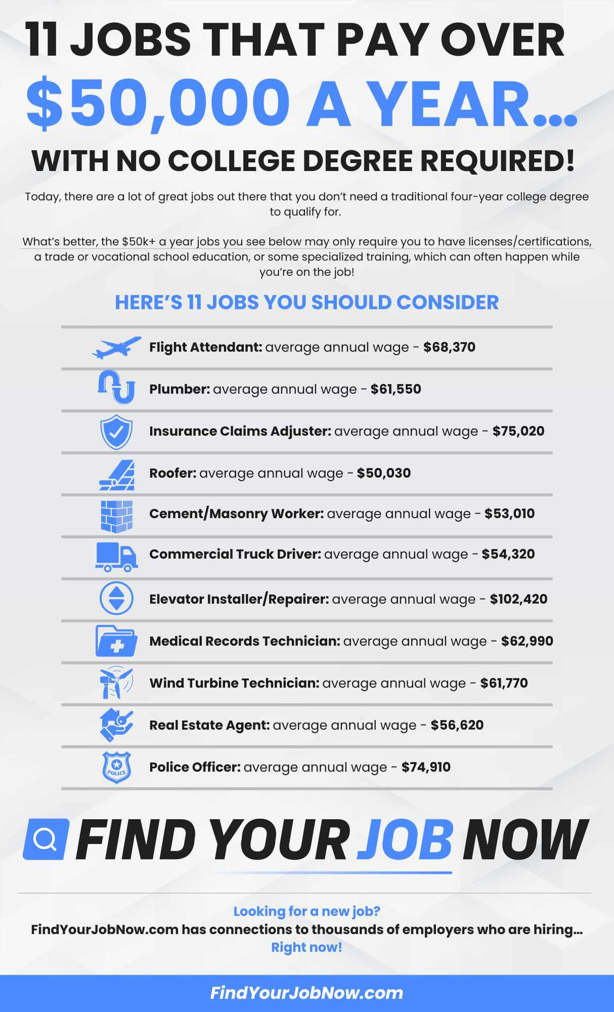 What’s better, the $50k+ a year jobs you see below may only require you to have licenses/certifications, a trade or vocational school education, or some specialized training, which can often happen while you’re on the job!