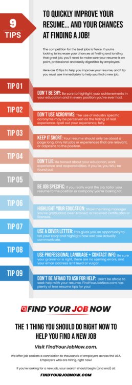 - Don’t be afraid to ask for help: Don’t be afraid to seek help with your resume. FindYourJobNow.com has plenty of free resume tips for you!