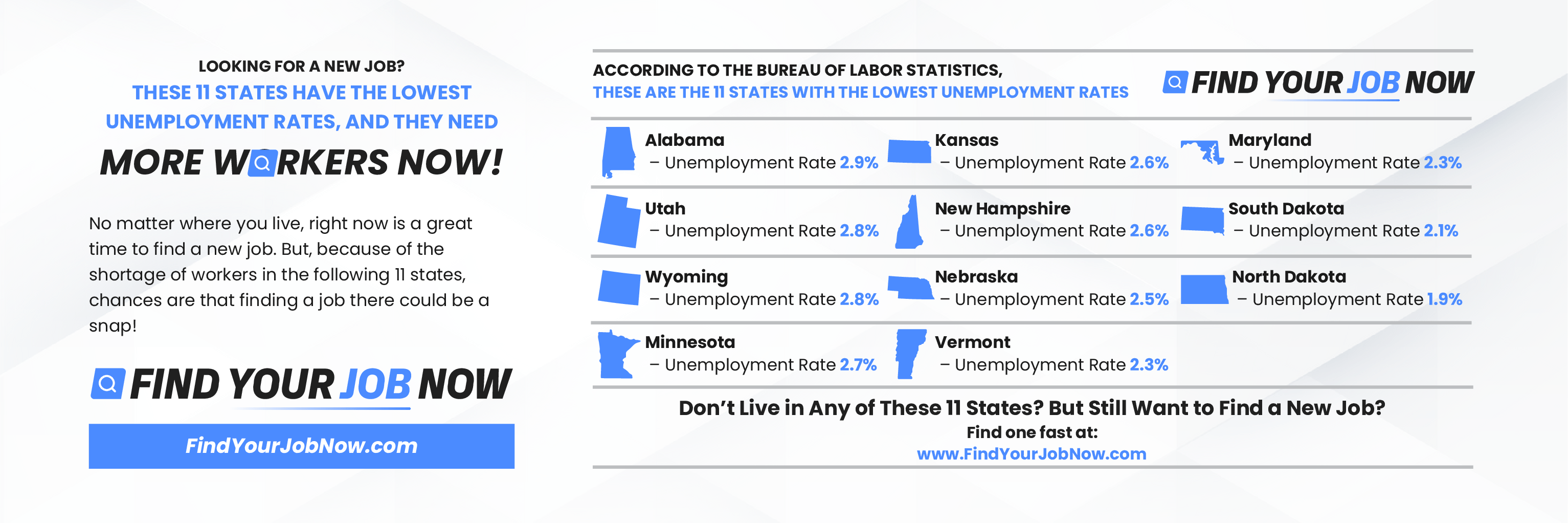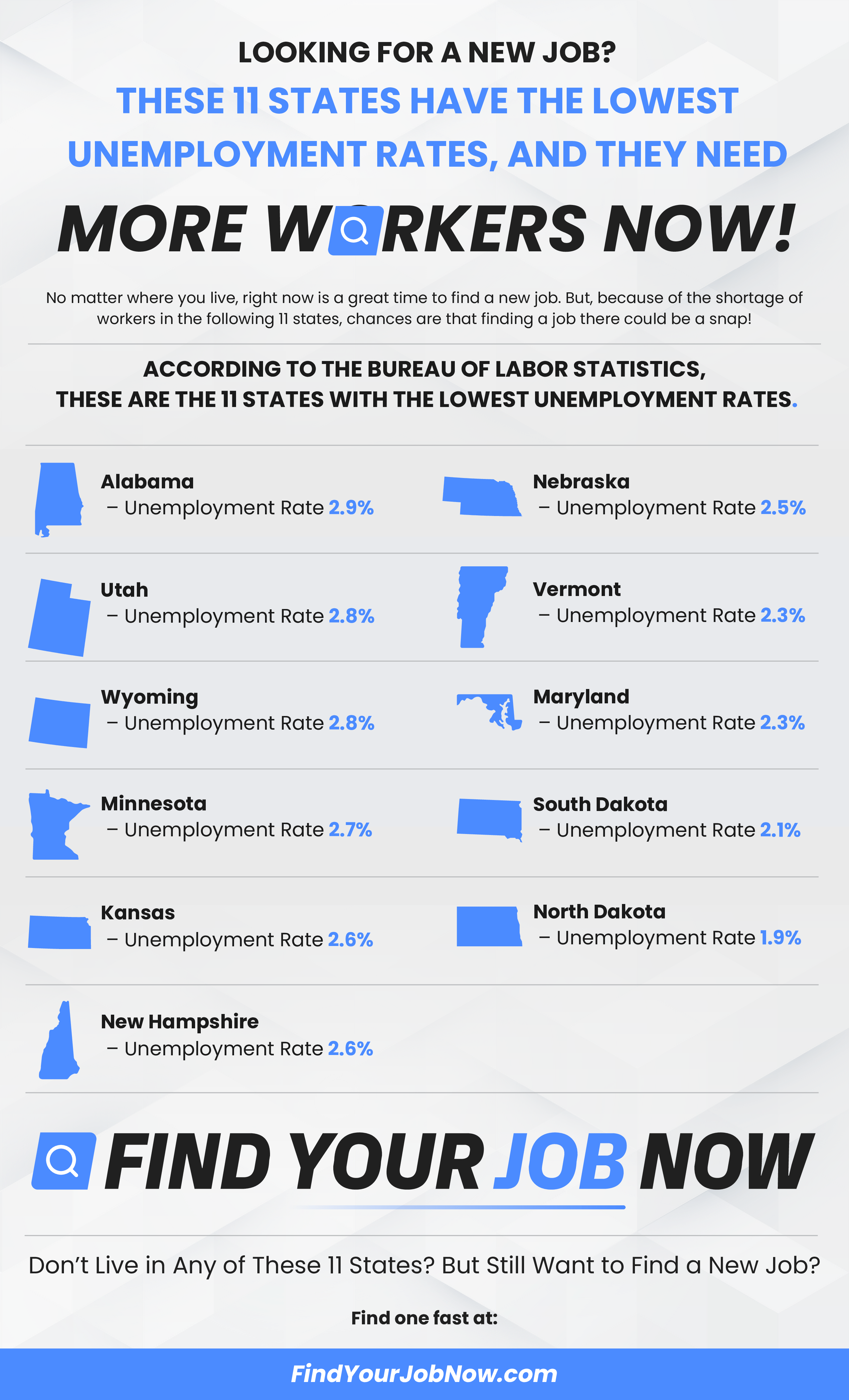 According to the Bureau of Labor Statistics, these are the 11 states with the lowest unemployment rates[1]