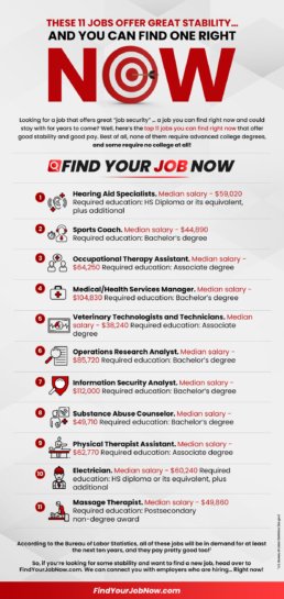 Looking for a job that offers great “job security” … a job you can find right now and could stay with for years to come? Well, here’s the top 11 jobs you can find right now that offer good stability and good pay. Best of all, none of them require advanced college degrees, and some require no college at all!